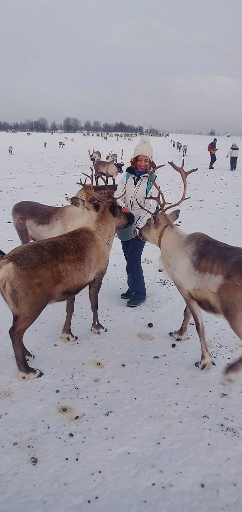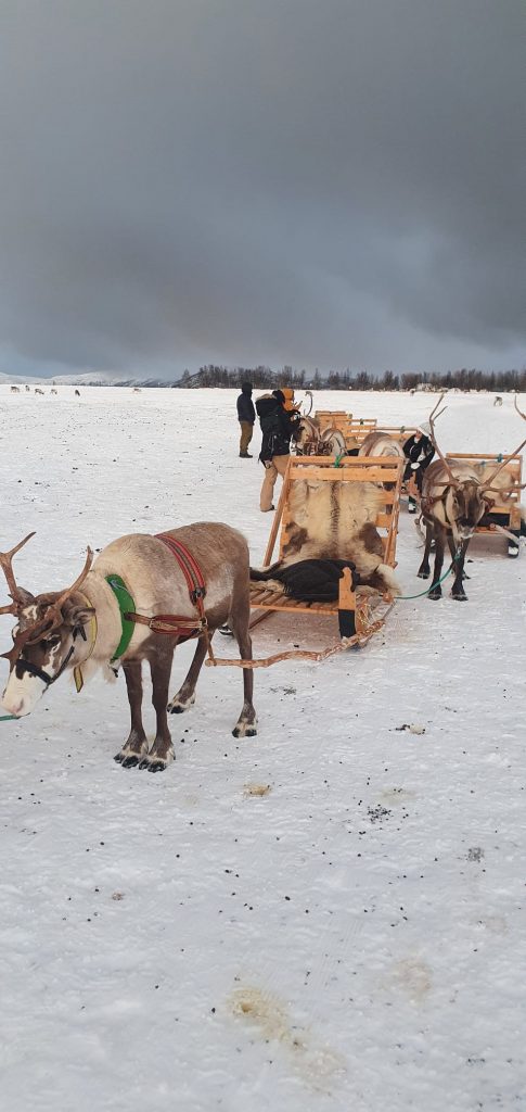 Am fost intampinati de pastorii Sami, care mare ne-a fost surpriza sa fie chiar fete. Ne-au facut o scurta introducere despre ferma, ne-au explicat ca renii sunt animale semi-salbatice, ei detinand peste 300 la ferma lor si ne-au lasat sa ii hranim ceea ce a fost foarte interesant. Apoi ne-am plimbat cu sania trasa de reni, moment in care a inceput si o ninsoare abundenta ceea ce a dat un strop de magie experientei.